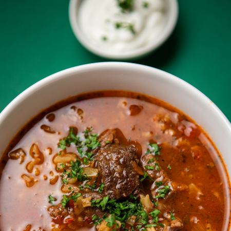 Koostisosad: puljong, riis, veiseliha, sibul, tomat, SELLER , tomatipasta, maitserohelised: koriander, petersell, till; maitseained: koriander, kumin; must pipar, tšillipipar, hmeli-suneli; valge veiniäädikas, rapsiõli